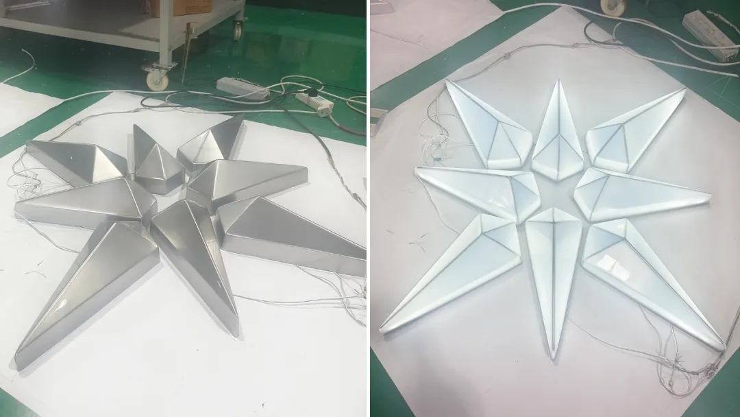 組裝:將電鍍好的亞克力燈箱進(jìn)行組裝,如LED光源等,形成完整的燈箱LOGO。然后進(jìn)行檢驗(yàn)和調(diào)試,包括形狀、顏色、電鍍效果等是否符合要求,并測(cè)試燈箱的照明效果和穩(wěn)定性。如有需要,可以進(jìn)行適當(dāng)?shù)恼{(diào)整和維修。